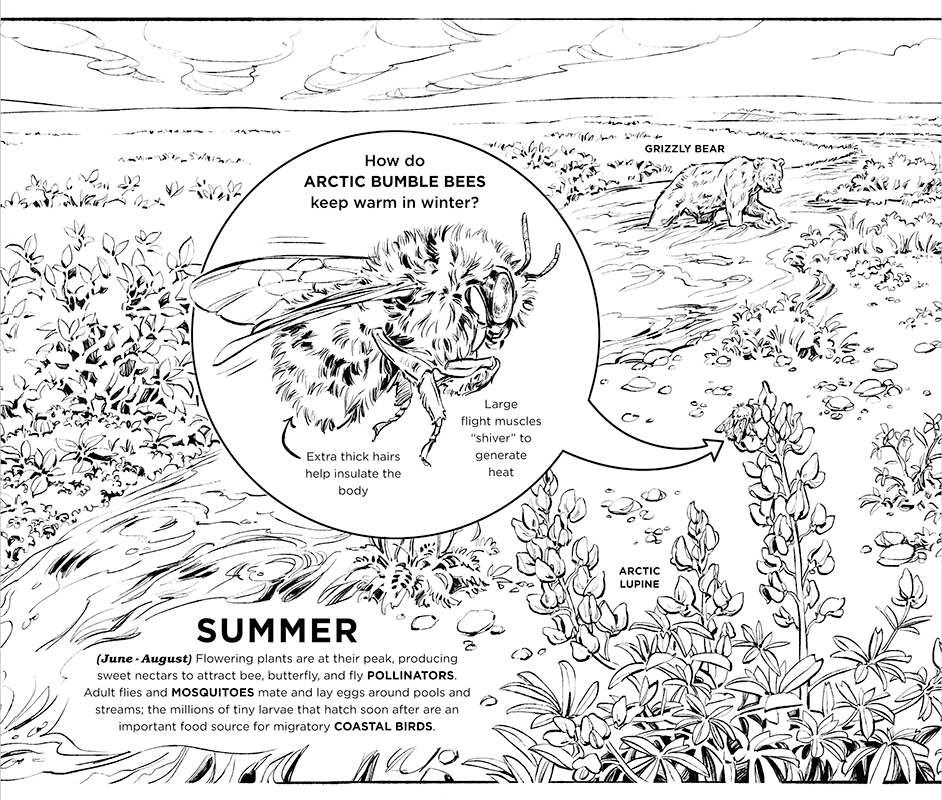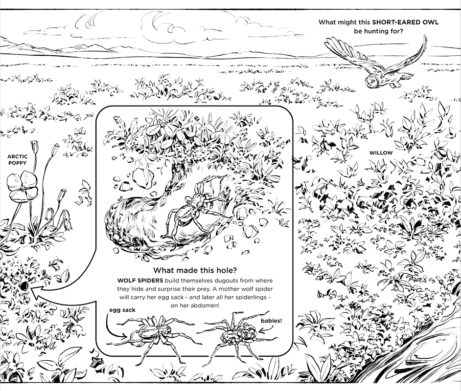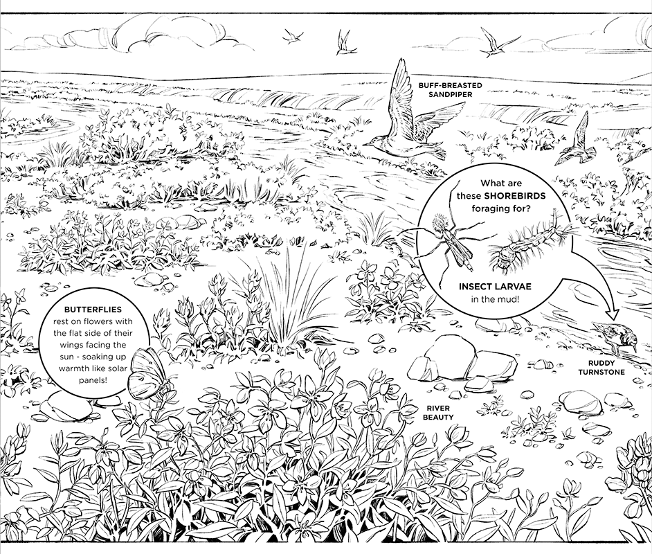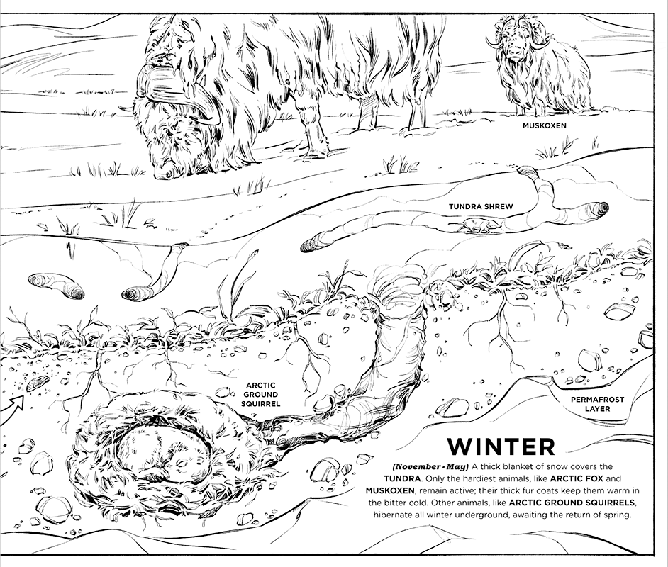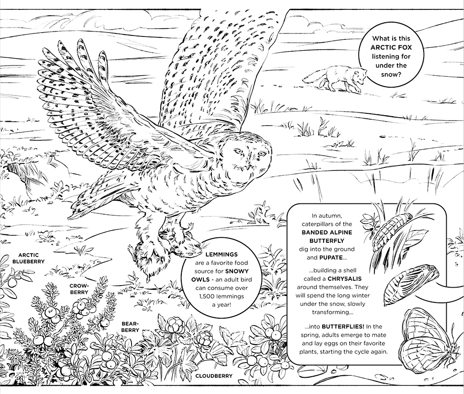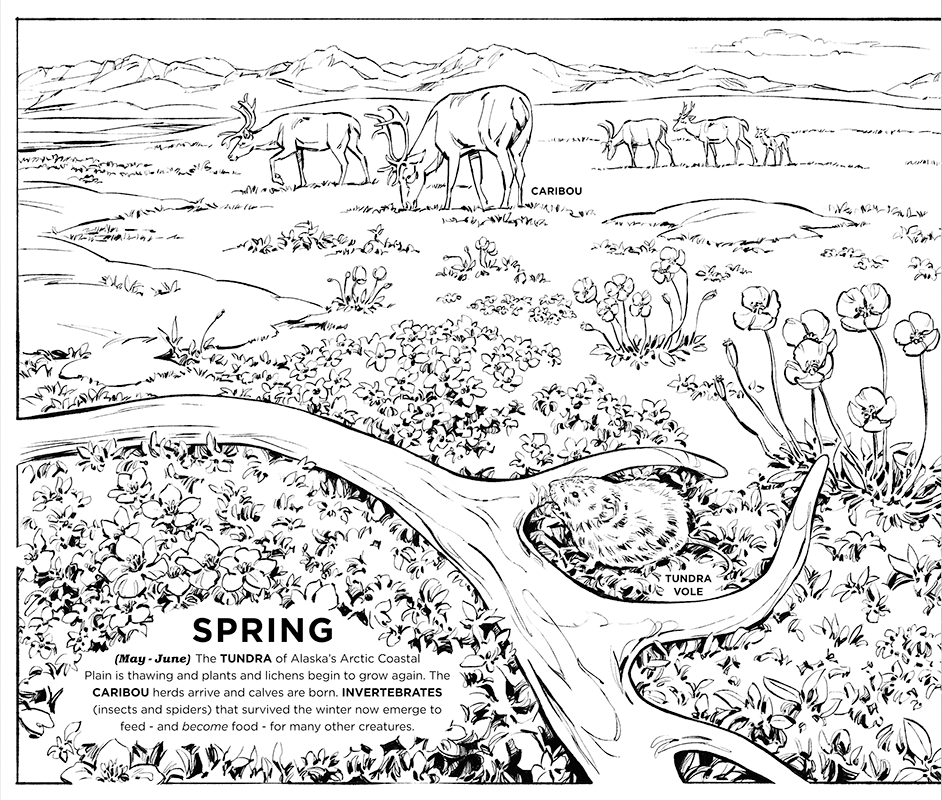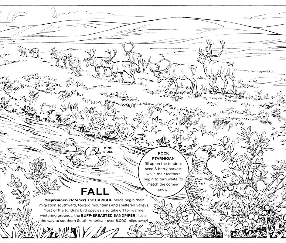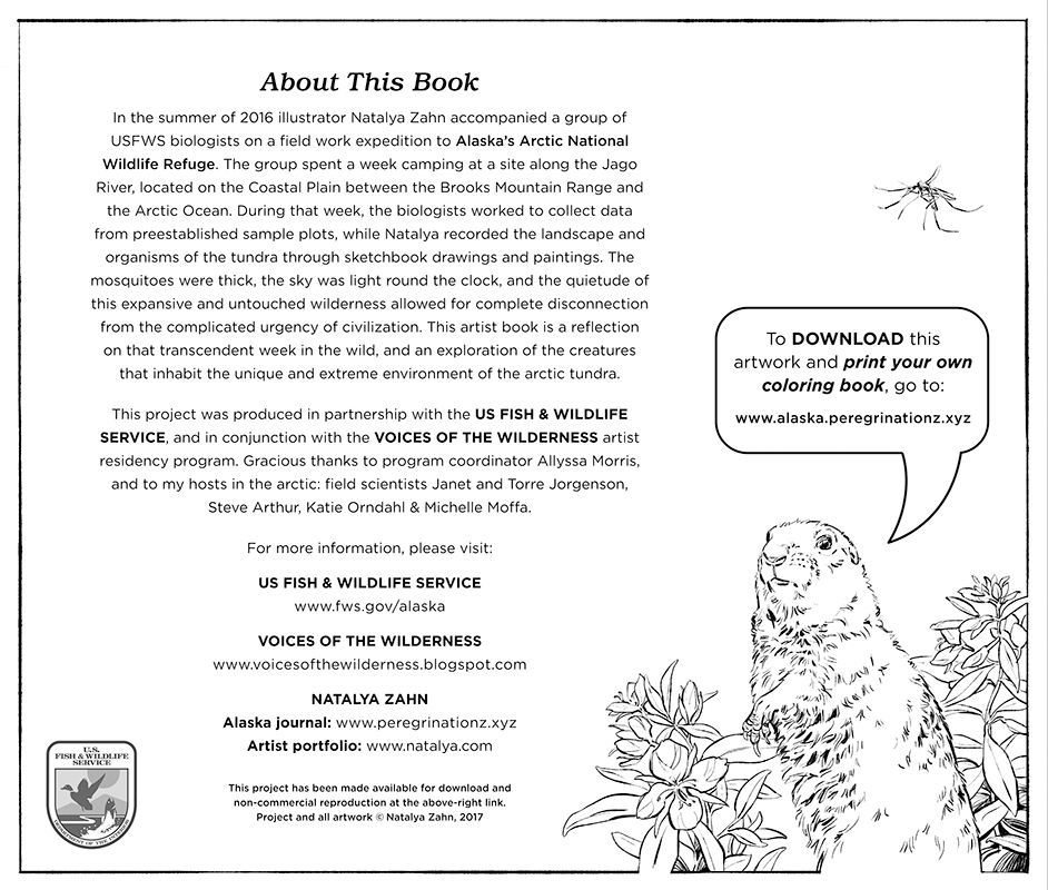 ARCTIC YEAR is a children's book exploring the creatures that inhabit the unique and extreme environment of the Alaskan tundra. The project was created by naturalist illustrator Natalya Zahn; as a participant in the Voices of the Wilderness artist residency program, Natalya accompanied a group of U.S. Fish & Wildlife Service biologists on a 2016 field work expedition to Alaska’s Arctic National Wildlife Refuge. This book is the culmination of her residency requirements and will be used by the USFWS in educational outreach programs promoting awareness of this extraordinary ecosystem.